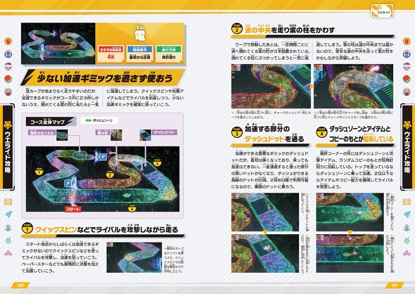 コース全体マップで、全9コース内にあるギミックの利用方法と、ライバルへの攻撃や走行ポイントがひと目でわかる!