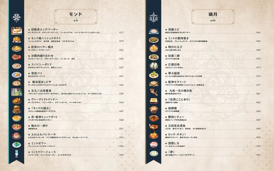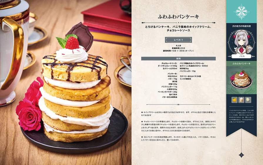 ・ゲーム序盤に登場する「モンド」「璃月」「スメール」「稲妻」の4地域を代表する60種類の料理の作りかたをレクチャー