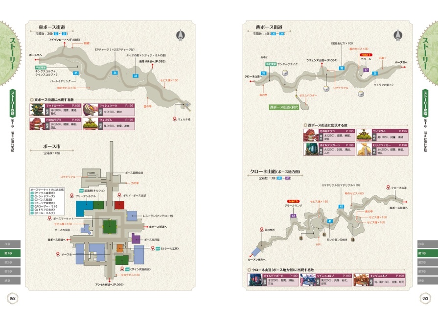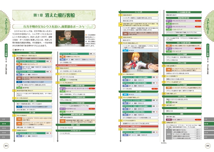 選択肢による獲得BP、書物や料理の入手タイミングを含む完全フローチャートに加え、宝箱やボスの位置がわかるマップ、サブクエストのクリア手順などを収録。