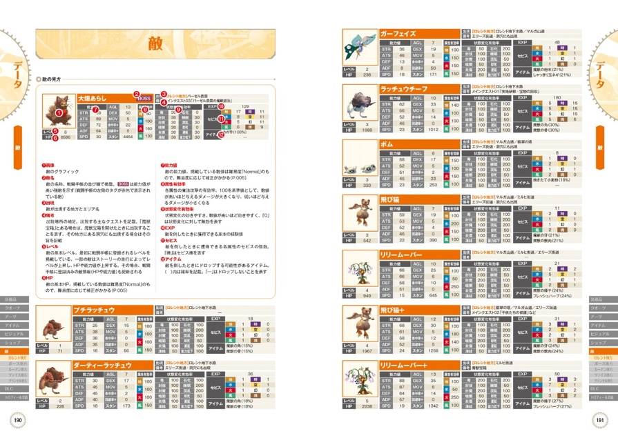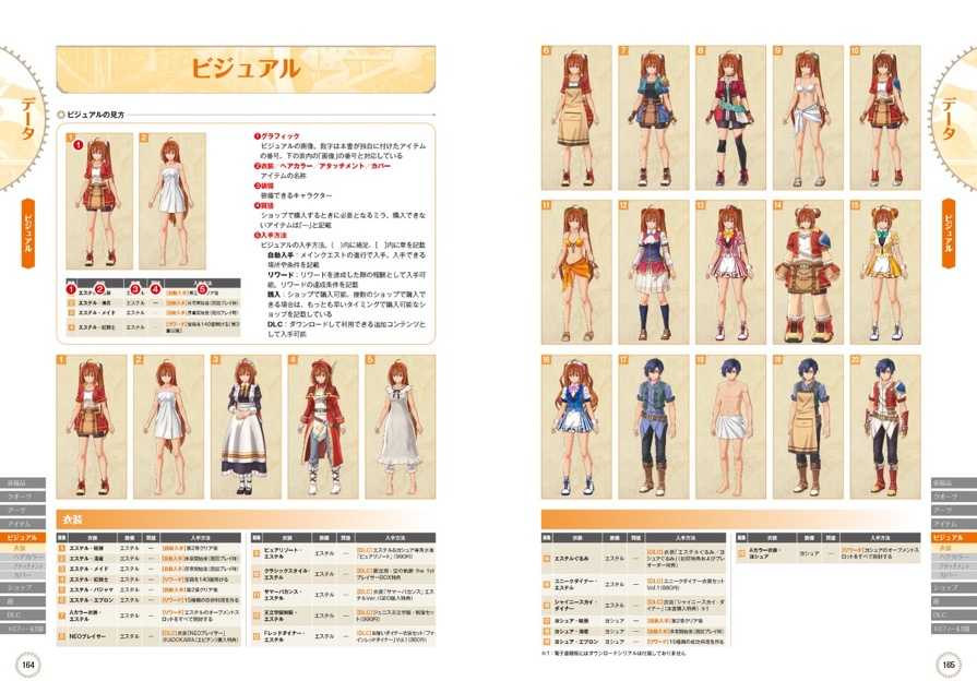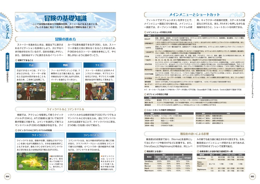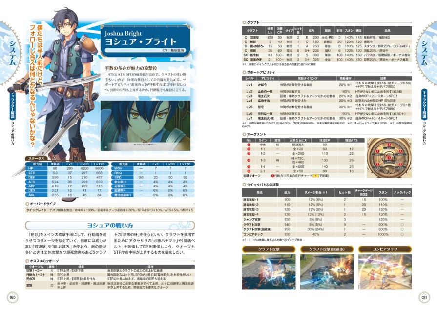 各キャラクターのオーブメントの構造やアクション、基本となる各種システムを解説しているほか、戦闘で役立つテクニックやダメージ計算式なども掲載。