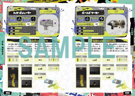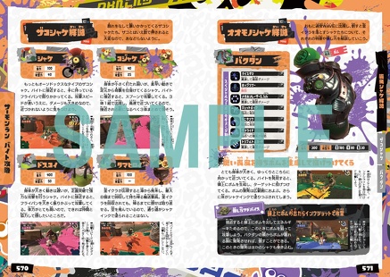 あらゆるブキ種について、各種データと合わせ基本の立ち回りを解説。さらにインク発射時の塗られ方や照準の変化を画像で掲載し、ブキ種ごとにインクの連射間隔やバラツキ、インクのダメージや消費量などを客観的な数値として公開。